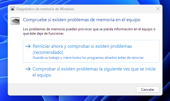 Cuando ejecutes mdsched.exe, aparecerán dos opciones:
